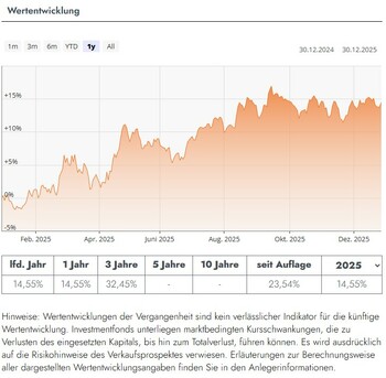 Bitte beachten Sie: Wertentwicklungen in der Vergangenheit sind kein verlässlicher Indikator für die künftige Wertentwicklung. Investmentfonds unterliegen marktbedingten Kursschwankungen, die zu Verlusten führen können. Es wird ausdrücklich auf die Risikohinweise des ausführlichen Verkaufsprospektes verwiesen.